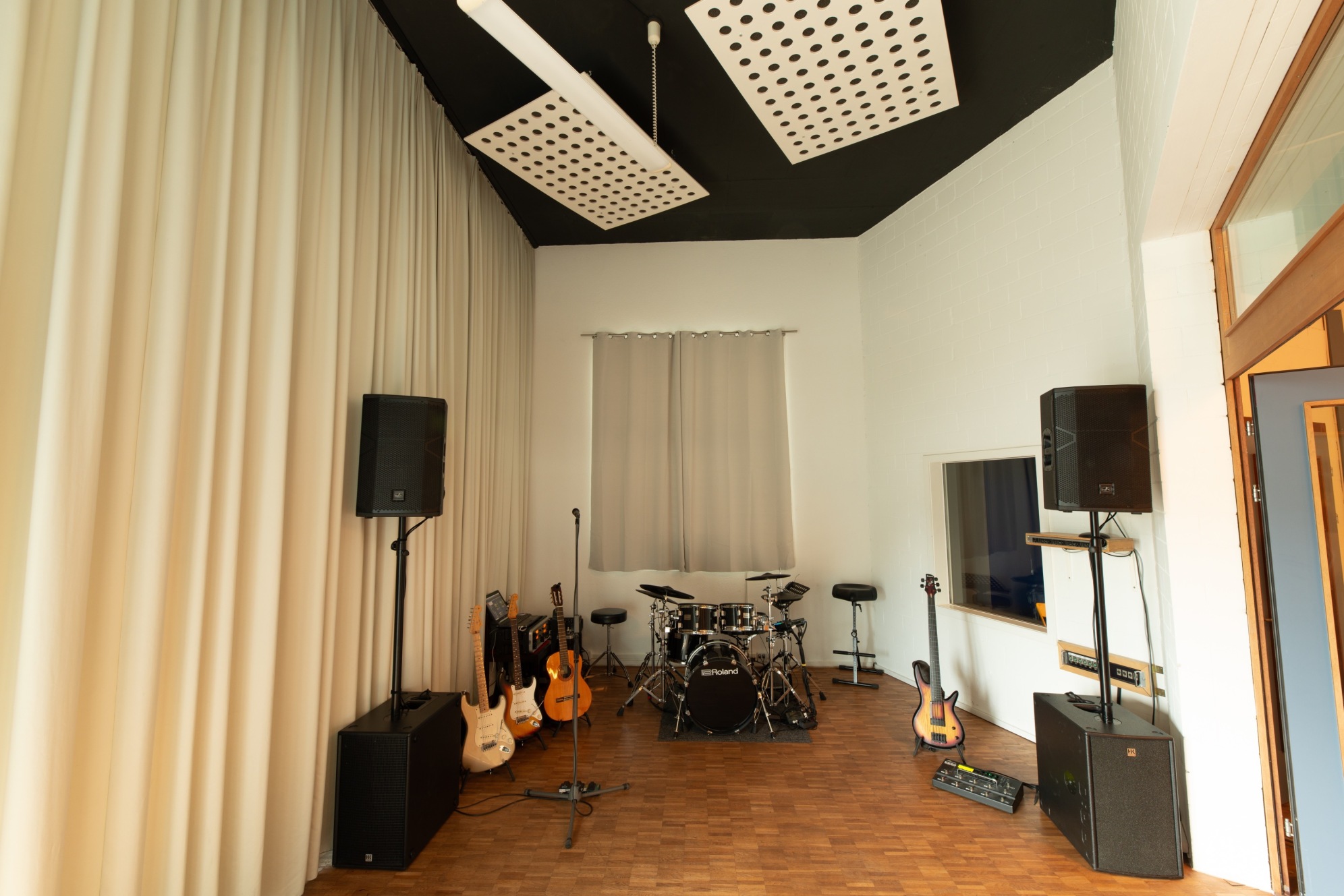 Das mittlere Studio ist etwas kleiner als das Hauptstudio und hat einen helleren Charakter. Großartiger Klang für Jazz-Klavieraufnahmen, akustisch isolierte Aufnahmen von Bläsern oder großen Schlagzeugklängen. Raumhöhe 4m60